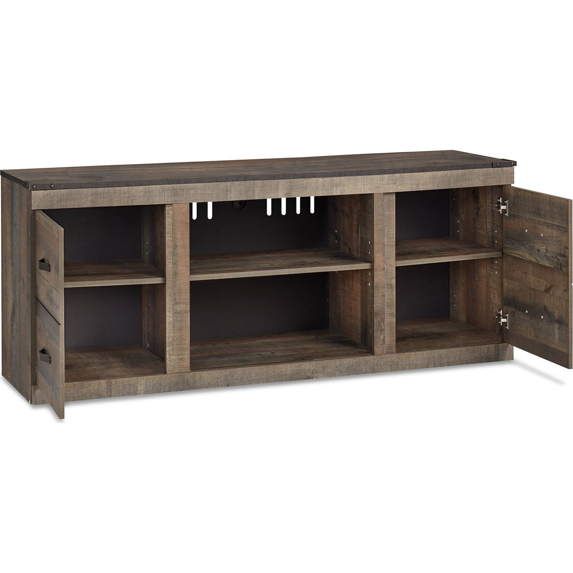 Affirmez un style à la fois rustique et raffiné avec ce meuble TV. Sa finition rustique et ses détails façon planches rendent hommage au bois de grange recyclé, tandis que les bandes couleur bronze ornées de clous décoratifs lui confèrent une touche industrielle élégante. Ses lignes épurées lui permettent de s'intégrer aussi bien à la campagne qu'en ville. Pour une ambiance encore plus chaleureuse, optez pour l'insert de cheminée en option (vendu séparément).