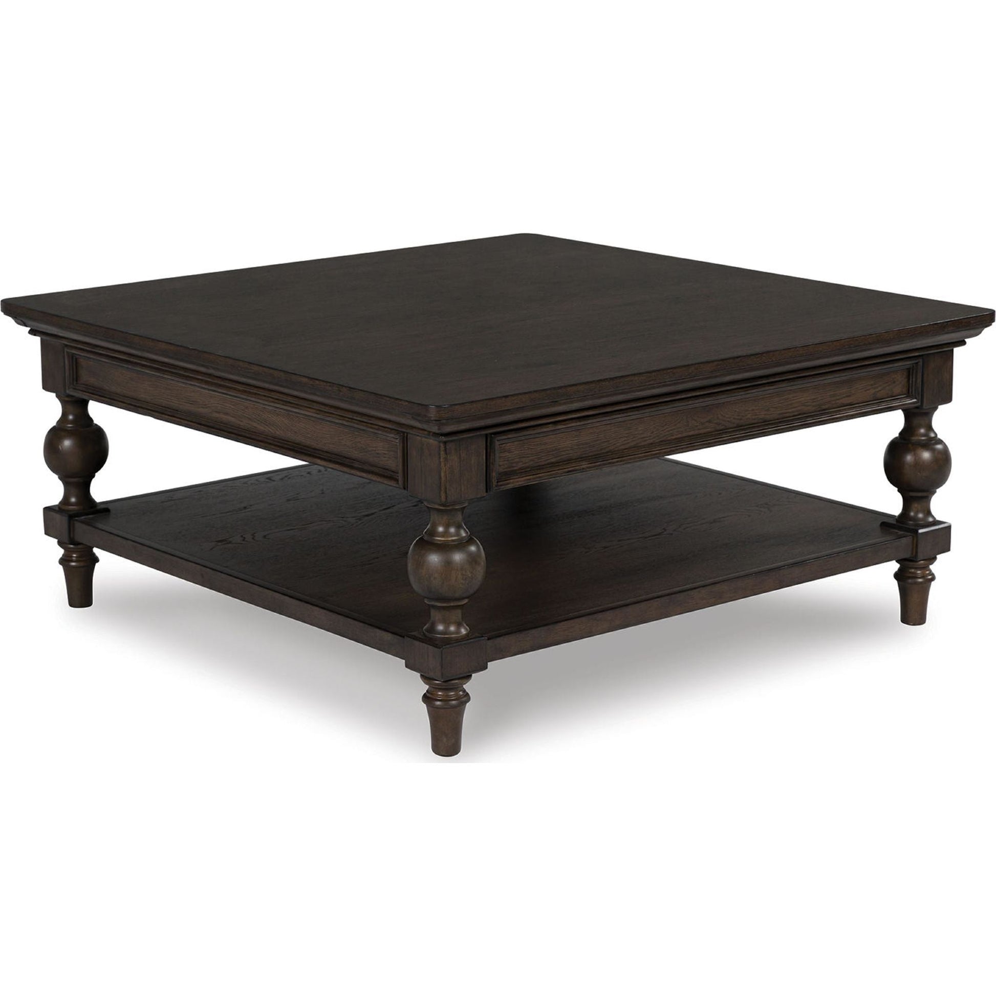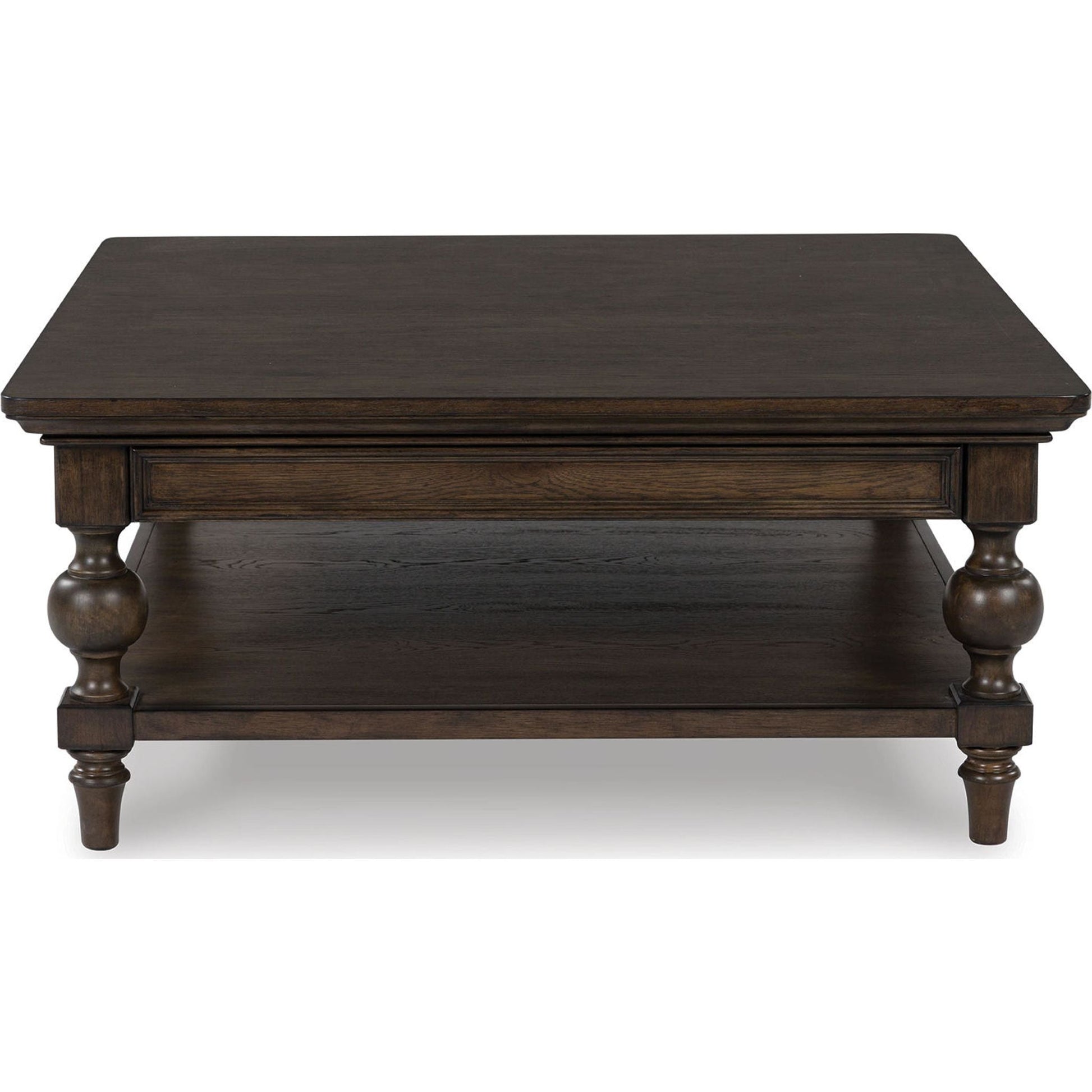 Pour les amateurs d'esthétique classique et d'élégance discrète, la table basse Veramond apporte une touche intemporelle à votre intérieur. Sa riche finition noyer brun se marie harmonieusement avec un plateau profilé et des pieds tournés de style balustre, pour un charme classique et raffiné. Sans oublier sa spacieuse étagère inférieure, idéale pour exposer vos petits objets décoratifs.