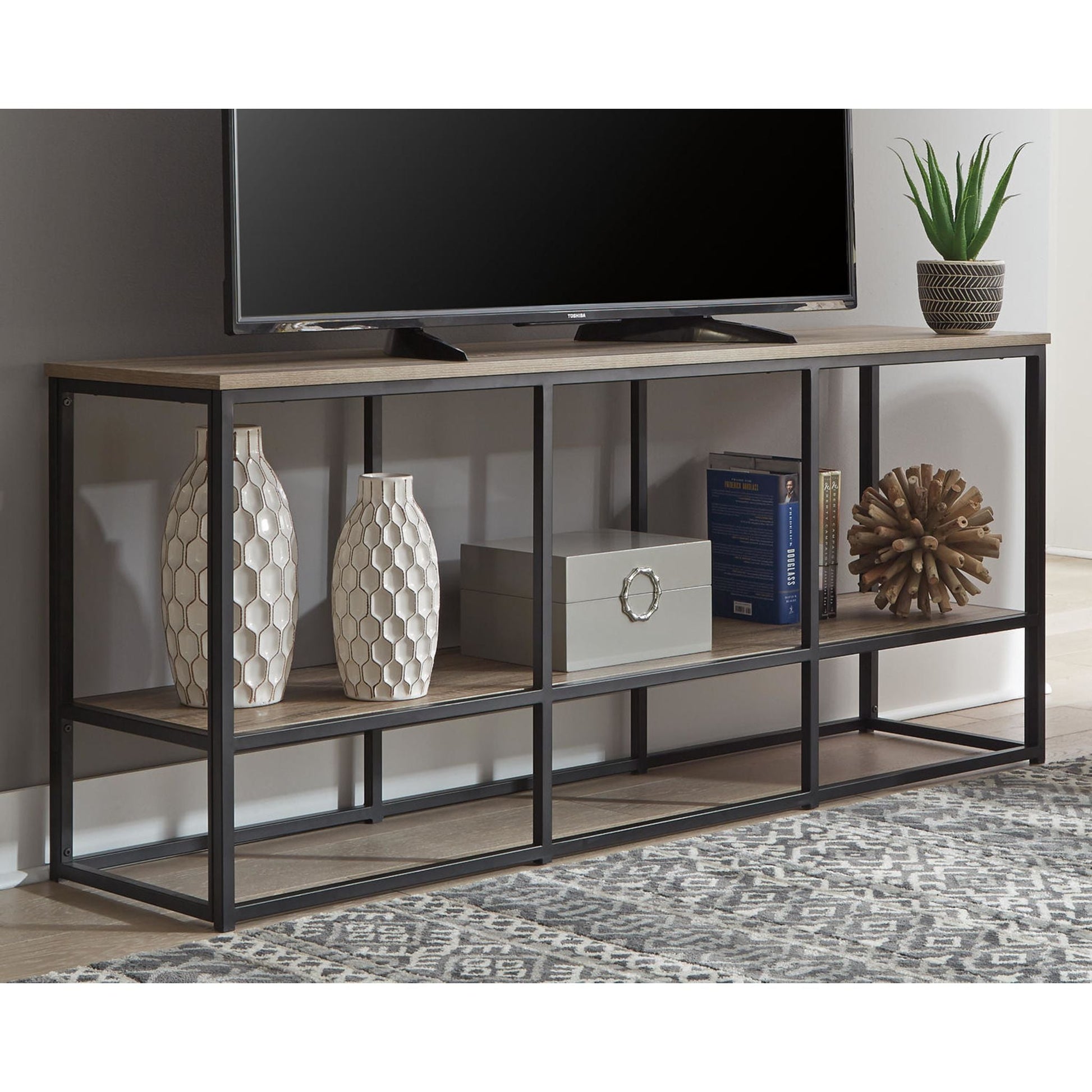 Le meuble TV Wadeworth, véritable ode au design contemporain décontracté et à l'esprit urbain, offre une grande polyvalence et une multitude de possibilités. Son élégante combinaison de bois patiné et de métal noir aux lignes épurées témoigne d'une maîtrise exceptionnelle du style ouvert.