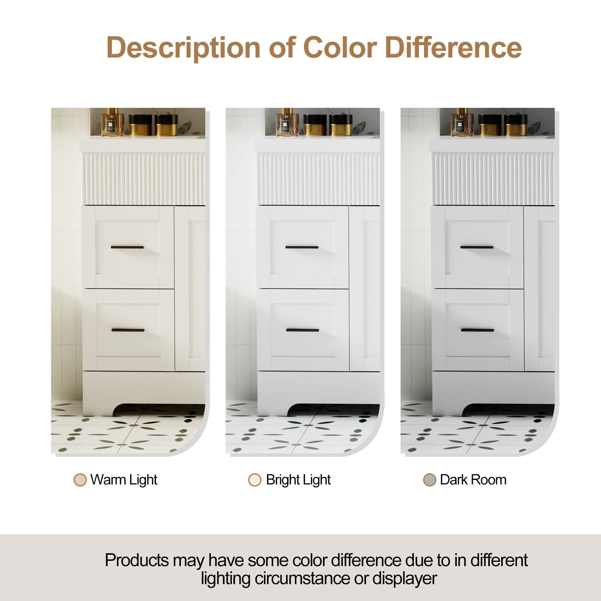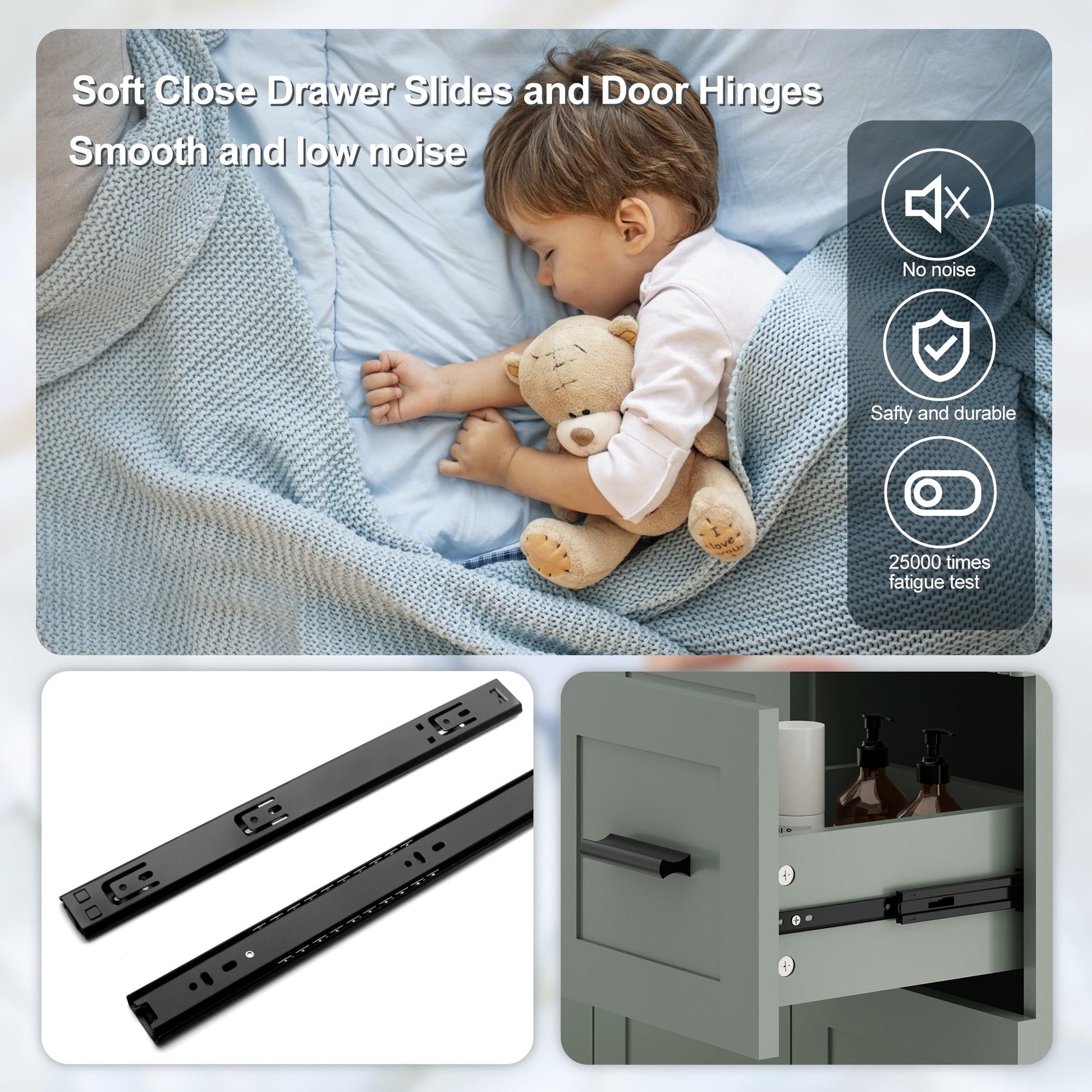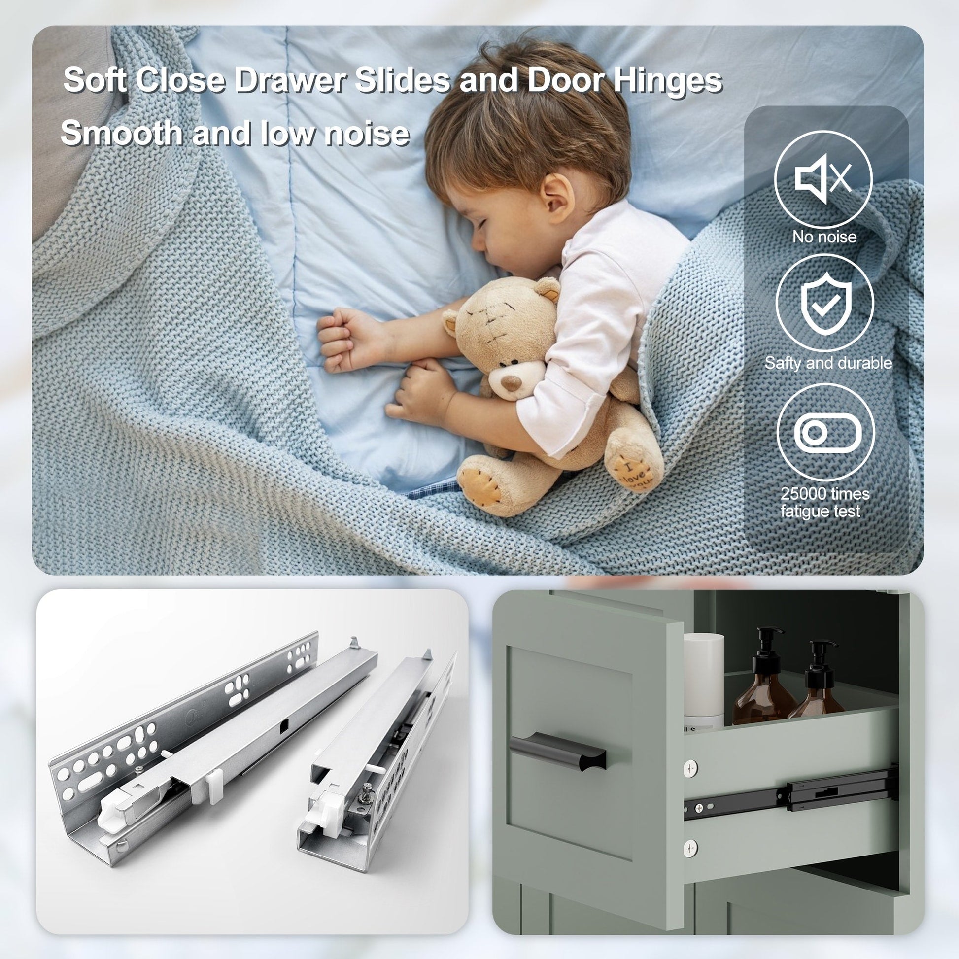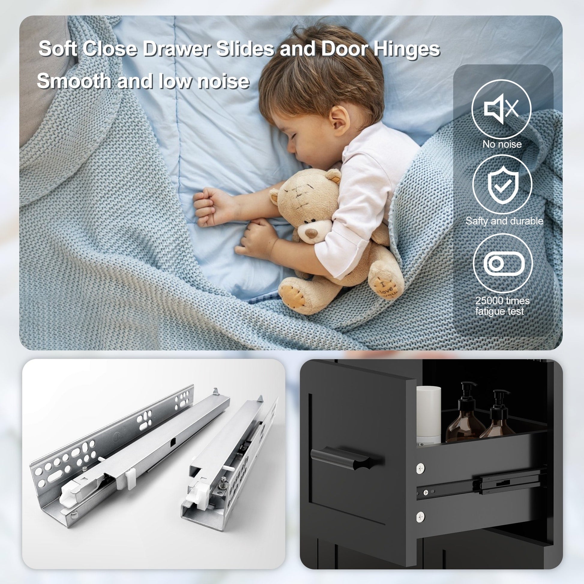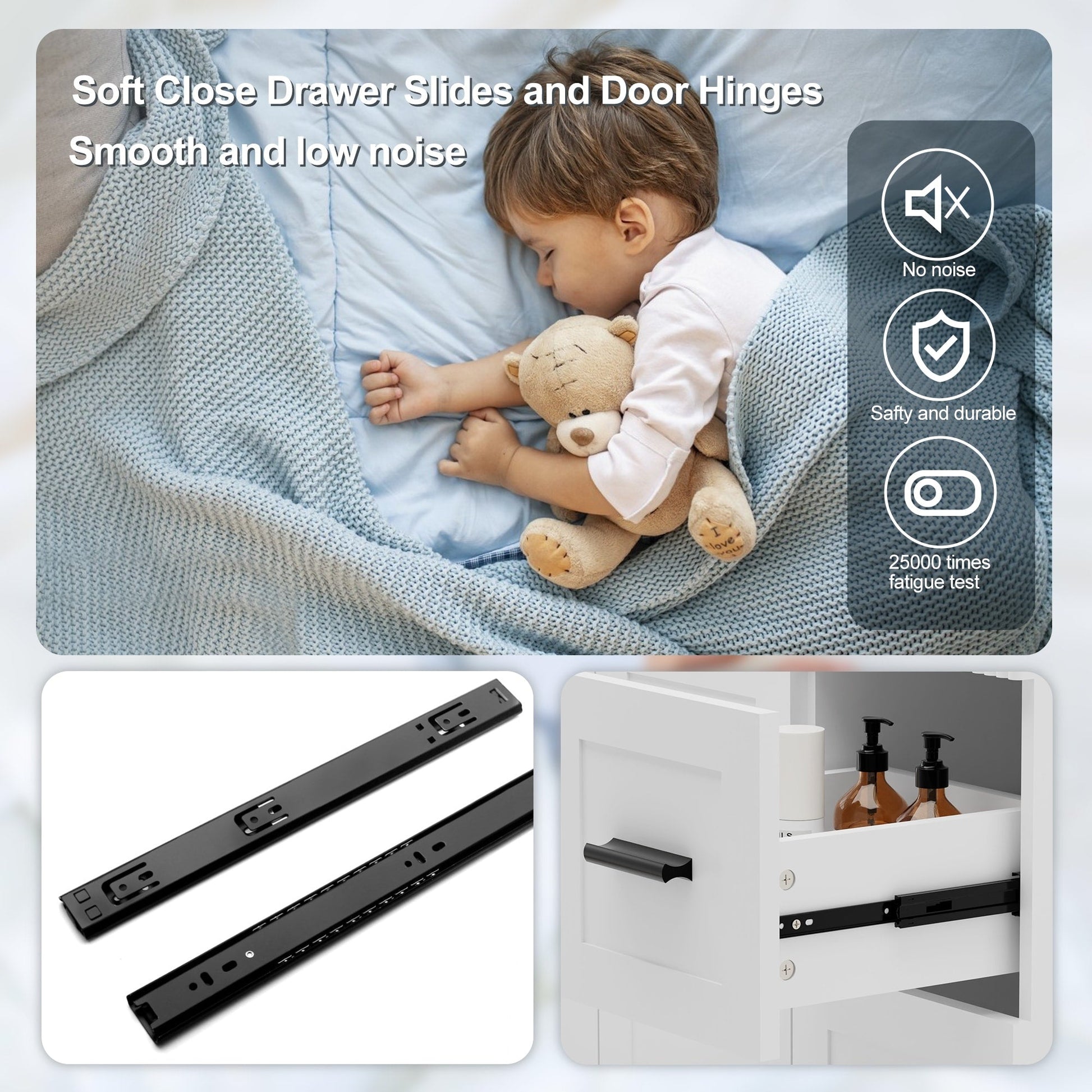 - Tiroirs à fermeture amortie haut de gamme : les glissières en acier inoxydable à montage sous plan (testées sur 25 000 cycles) garantissent un fonctionnement silencieux et fluide. Deux tiroirs spacieux et une étagère réglable permettent d’organiser facilement vos articles de toilette.