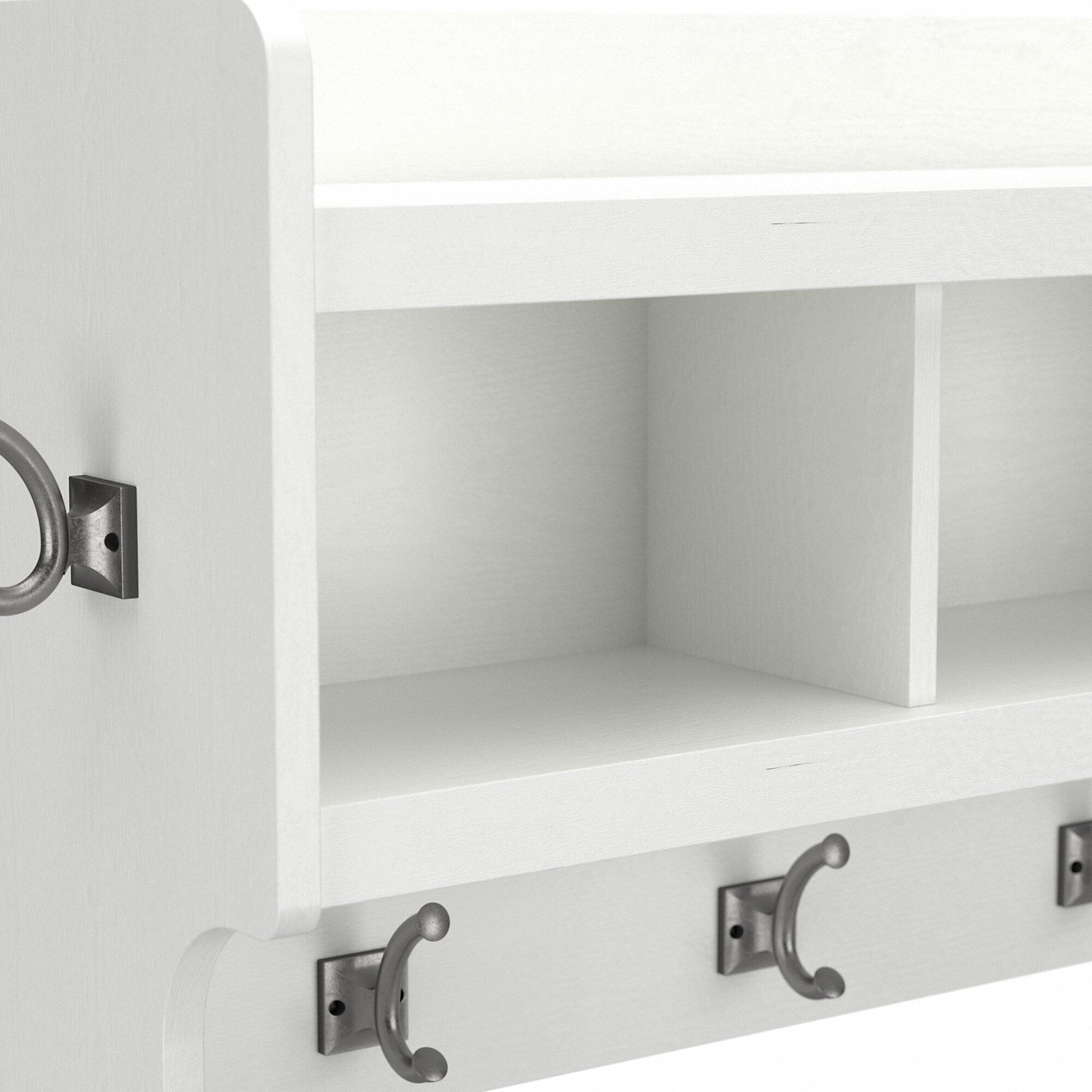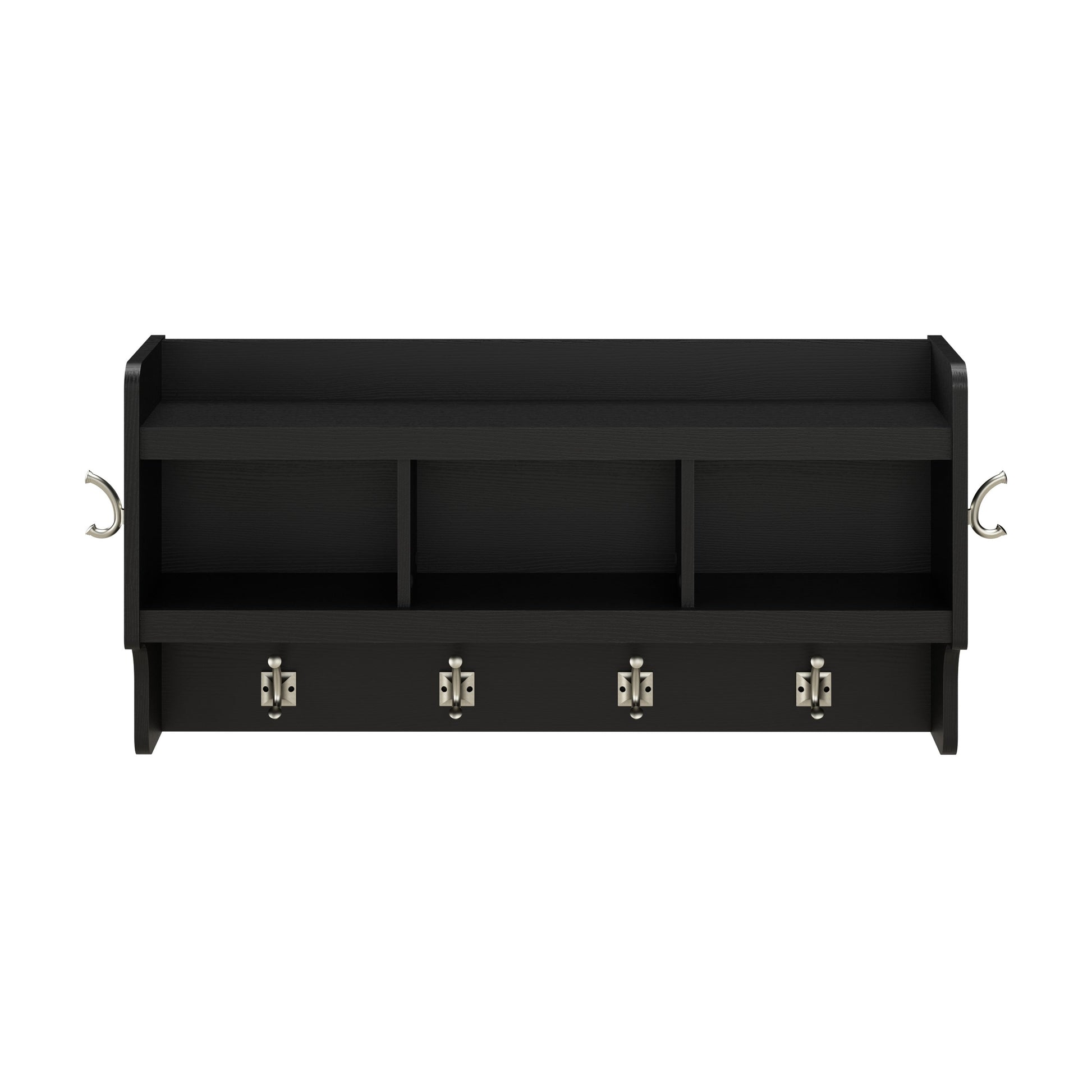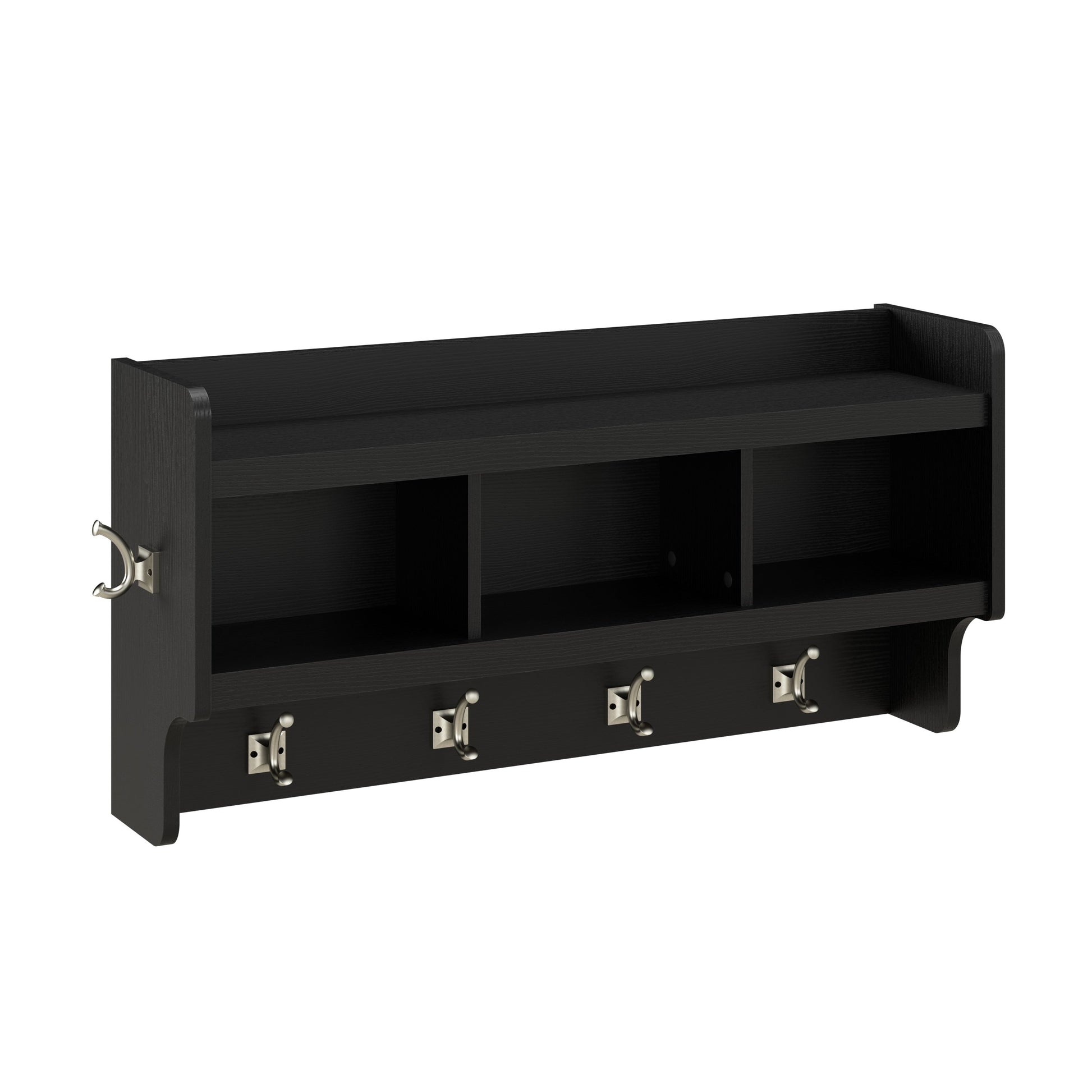 - L'étagère murale comprend quatre crochets doubles à l'avant et un de chaque côté pour suspendre vestes, chapeaux, écharpes et autres accessoires.