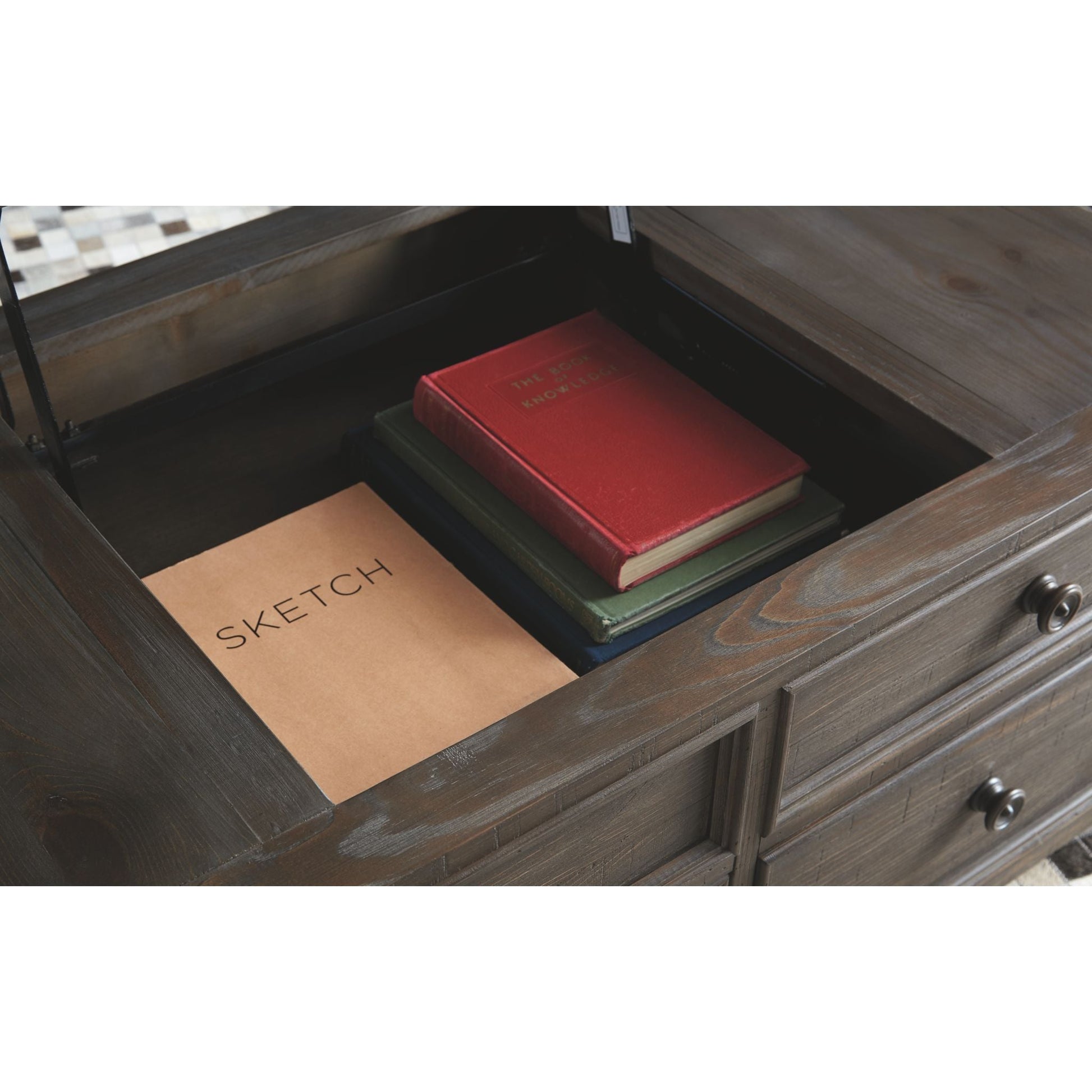 Inspirée du mobilier rustique et chaleureux des chalets d'antan, la table basse relevable Wyndahl revisite avec brio le passé et le présent. Ses détails distinctifs incluent des moulures robustes, des façades de tiroirs surélevées qui apportent du relief et une finition en pin vieilli patiné, légèrement brossée, véritable œuvre d'art. Son plateau relevable à ressort, idéal pour les repas improvisés et le travail sur ordinateur portable, fait de cette pièce d'inspiration vintage un meuble résolument moderne.