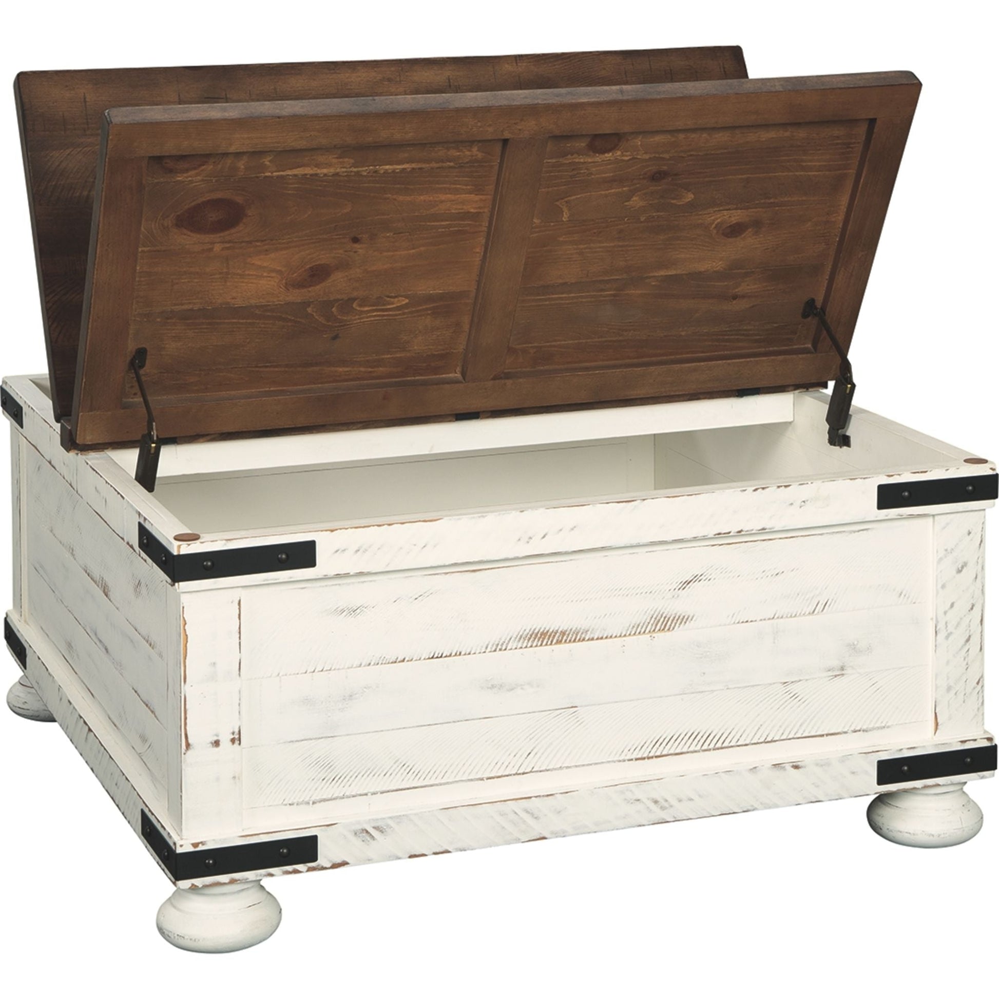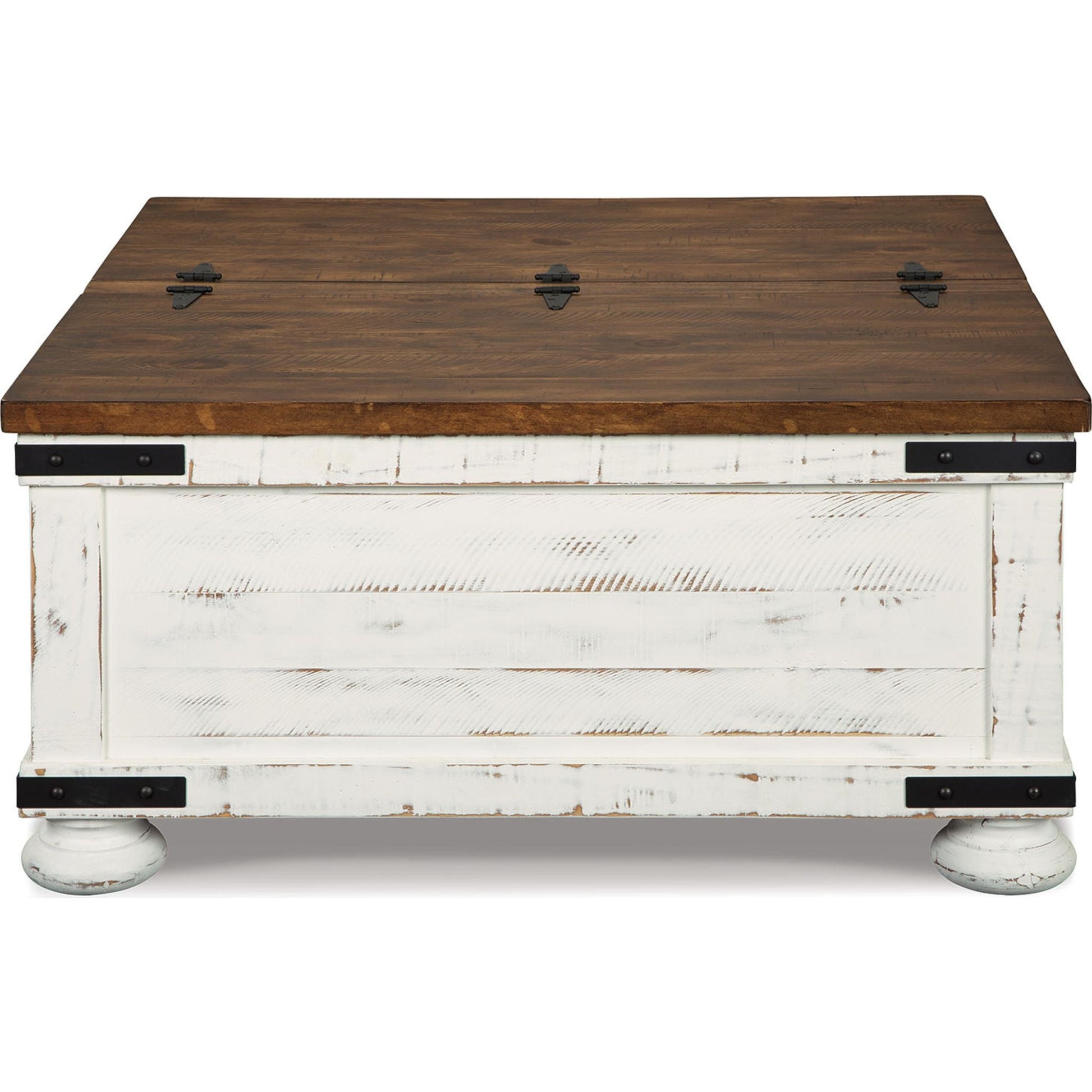 Un véritable coup de cœur ! Avec sa finition bicolore, son couvercle à double ouverture et son vaste espace de rangement, la table basse carrée Wystfield réinvente le style rustique et champêtre. Son design soigné se caractérise par un effet planches, un vieillissement prononcé et des ferrures de style industriel.