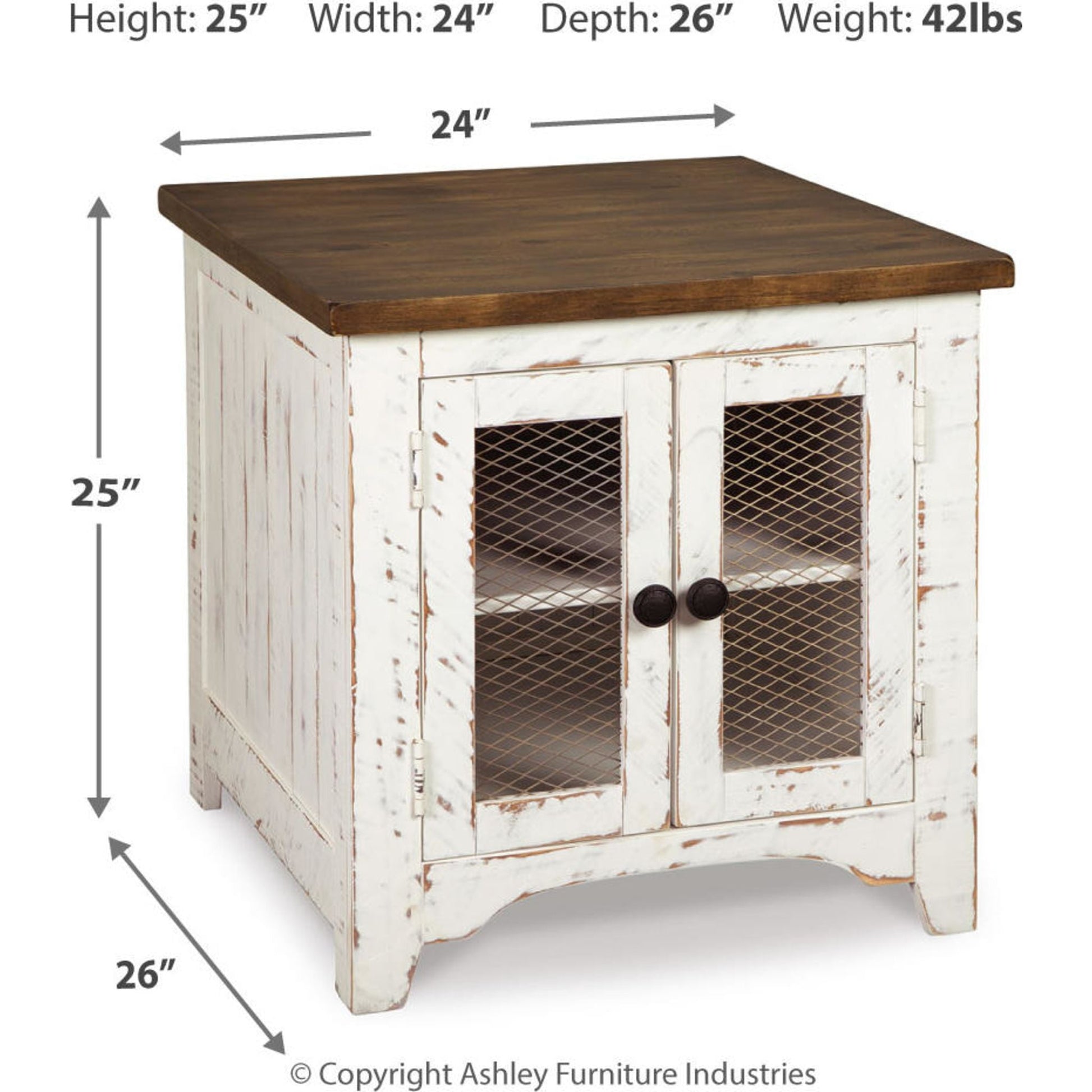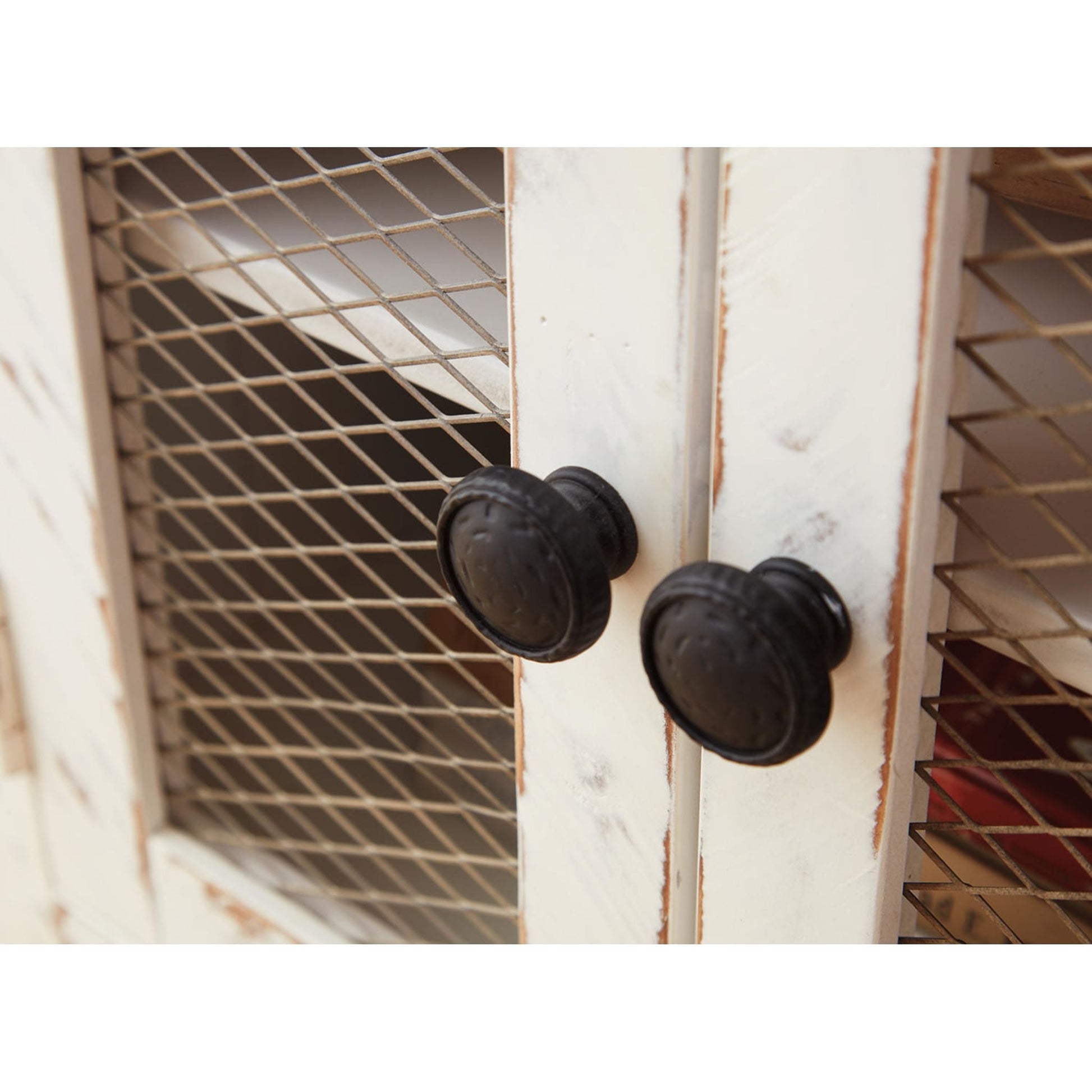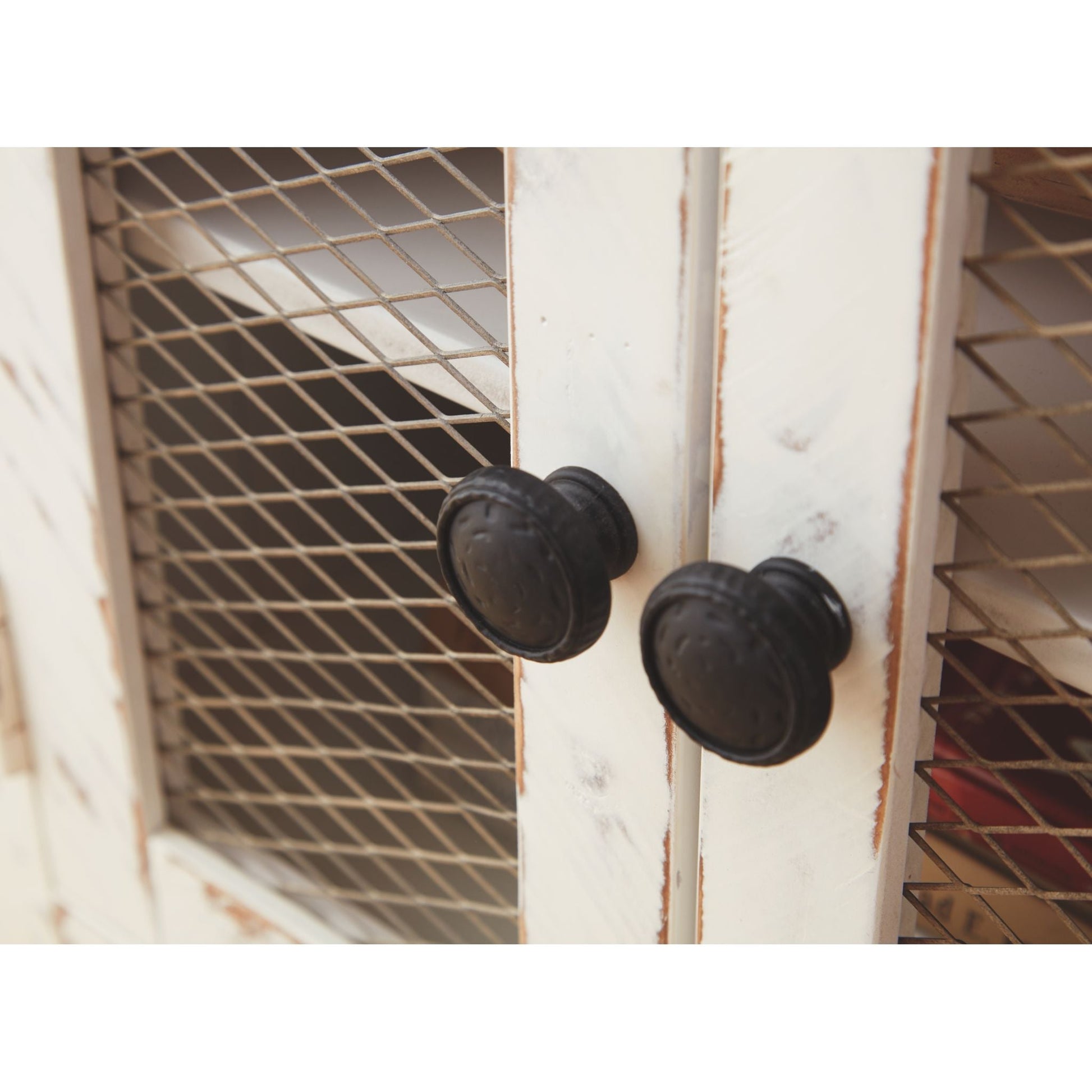 Un véritable coup de cœur. Avec sa finition bicolore associant un blanc vieilli à une teinte pin naturel patinée, la table d'appoint Wystfield sublime le style rustique d'une maison de campagne. Son charme est rehaussé par des étagères de rangement visibles à travers les portes d'armoire ornées de grilles métalliques.