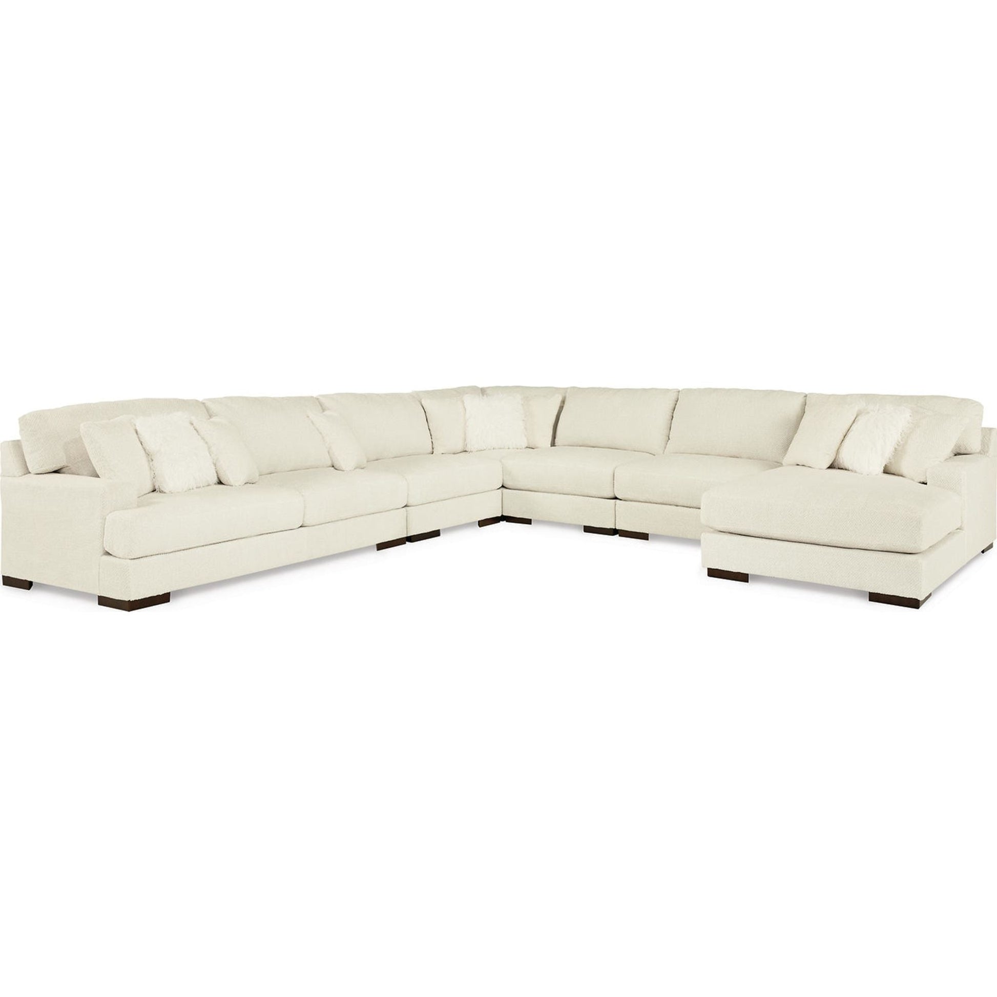 Le canapé d'angle Zada, avec sa microfibre d'une douceur incomparable, offre un confort et un style exceptionnels. Son design contemporain chaleureux et accueillant se révèle pleinement grâce à ses larges accoudoirs et ses lignes épurées. Des coussins décoratifs en fausse fourrure apportent une touche glamour. Un pouf assorti en fausse fourrure est disponible séparément.