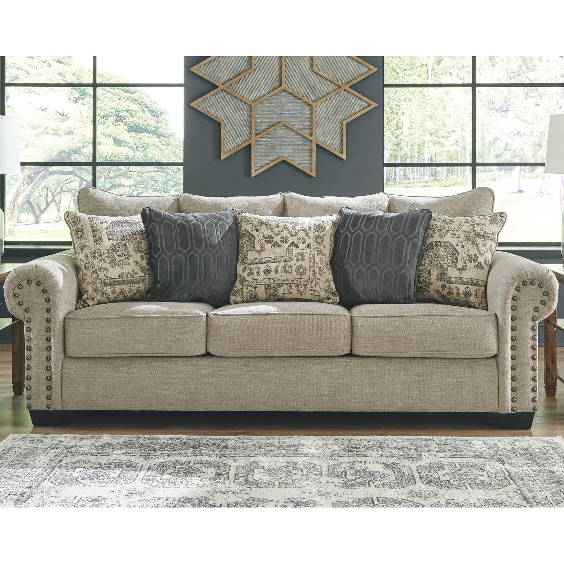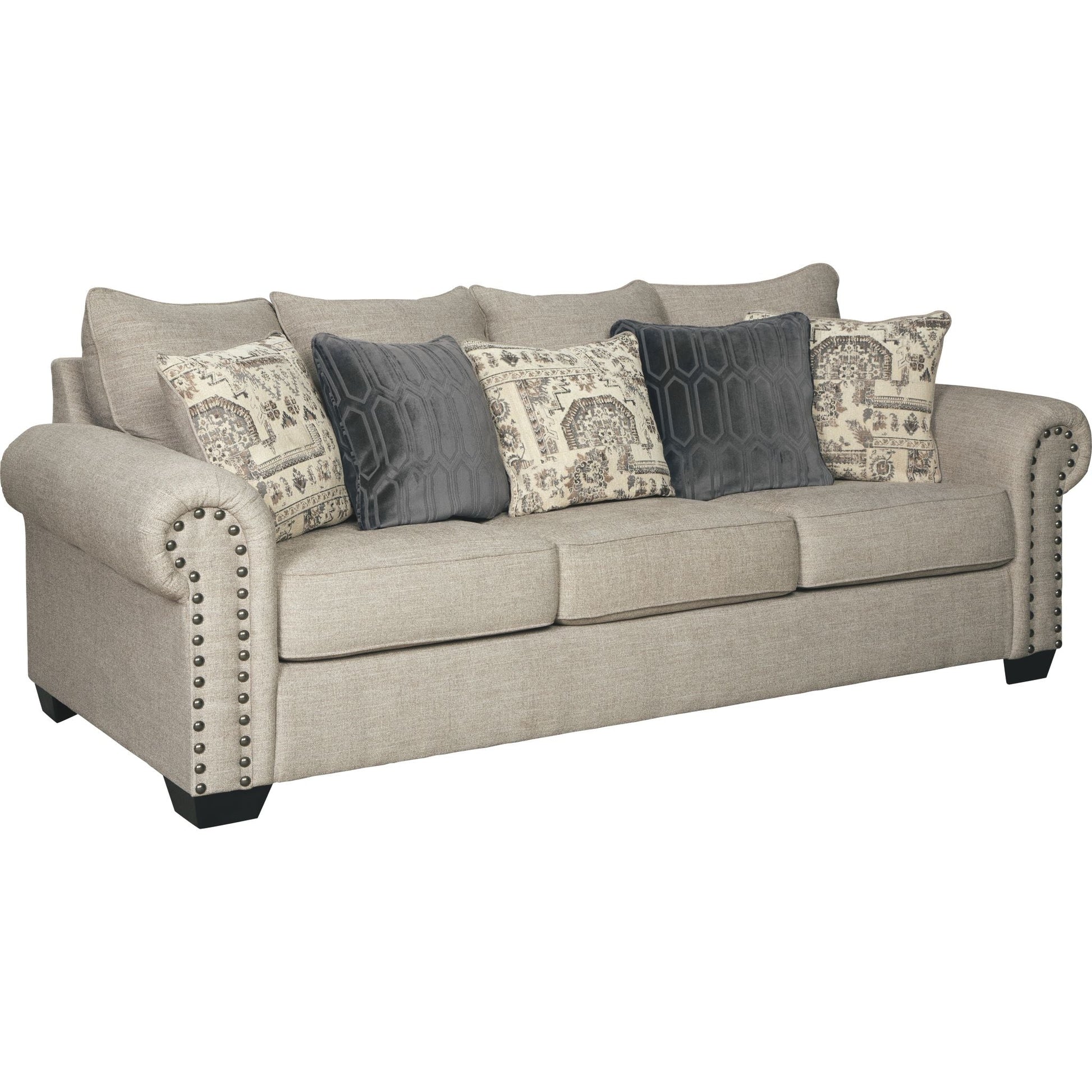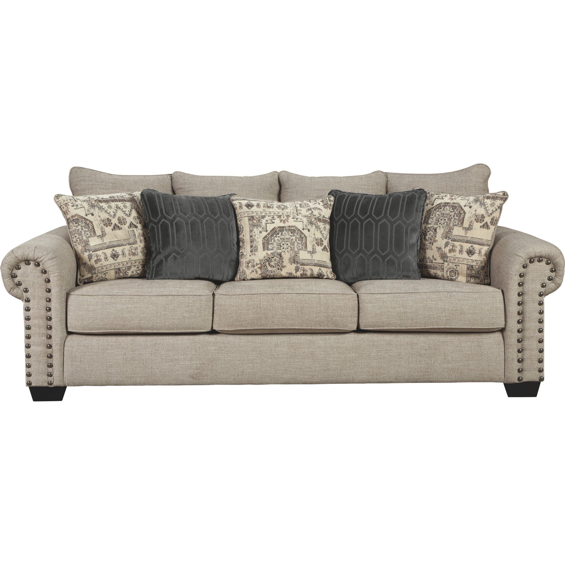 Le canapé Zarina vous permet d'affirmer votre style avec élégance à un prix abordable. Ses accoudoirs arrondis, d'inspiration traditionnelle, sont modernisés par une garniture cloutée surdimensionnée finition nickel noir. Le revêtement en lin tissé, d'un beige grès frais et épuré, est rehaussé de coussins design qui ajoutent texture et sophistication.